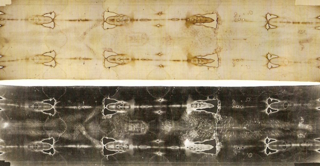 Tanto en el positivo como en el negativo, se observan las dos imágenes frontal y dorsal, yuxtapuestas por la cabeza, debido al modo cómo el lienzo cubrió el cadáver de Jesús, según la miniatura que acabamos de ver.