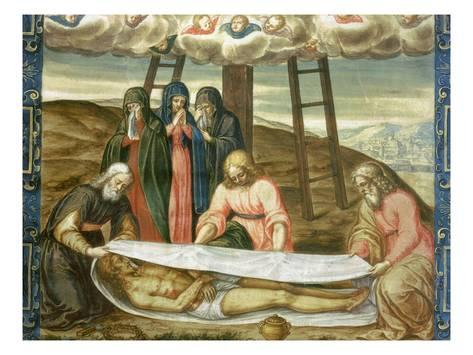 Los detalles de esta pintura muestran cómo fue empleada la Sábana para envolver el cuerpo de Jesús. Por eso en la Sábana Santa aparecen las figuras frontal y dorsal yuxtapuestas por la cabeza.